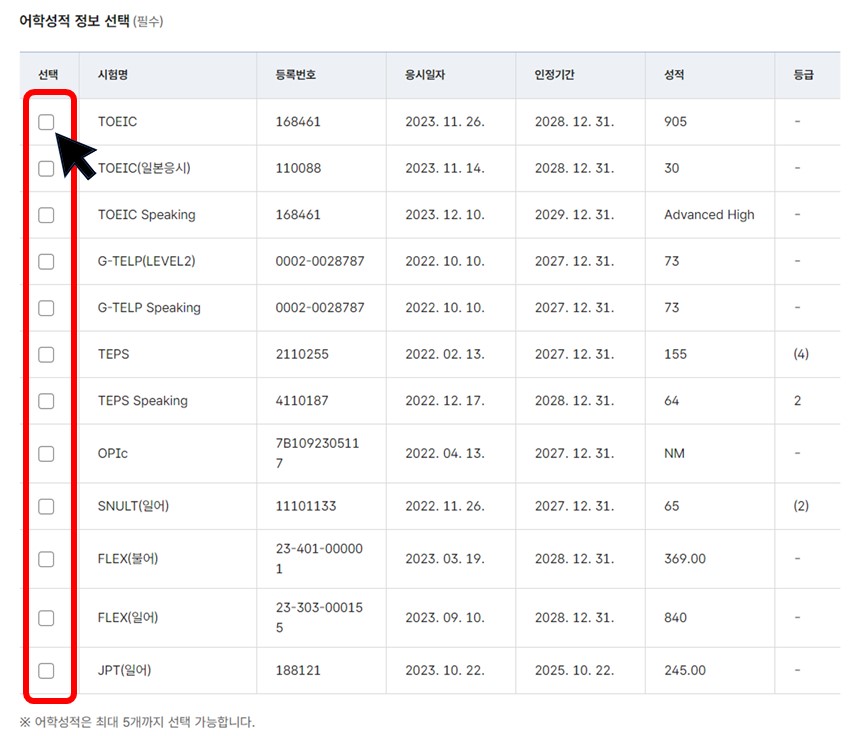(어학성적은 최대 5개까지 선택 가능합니다.)