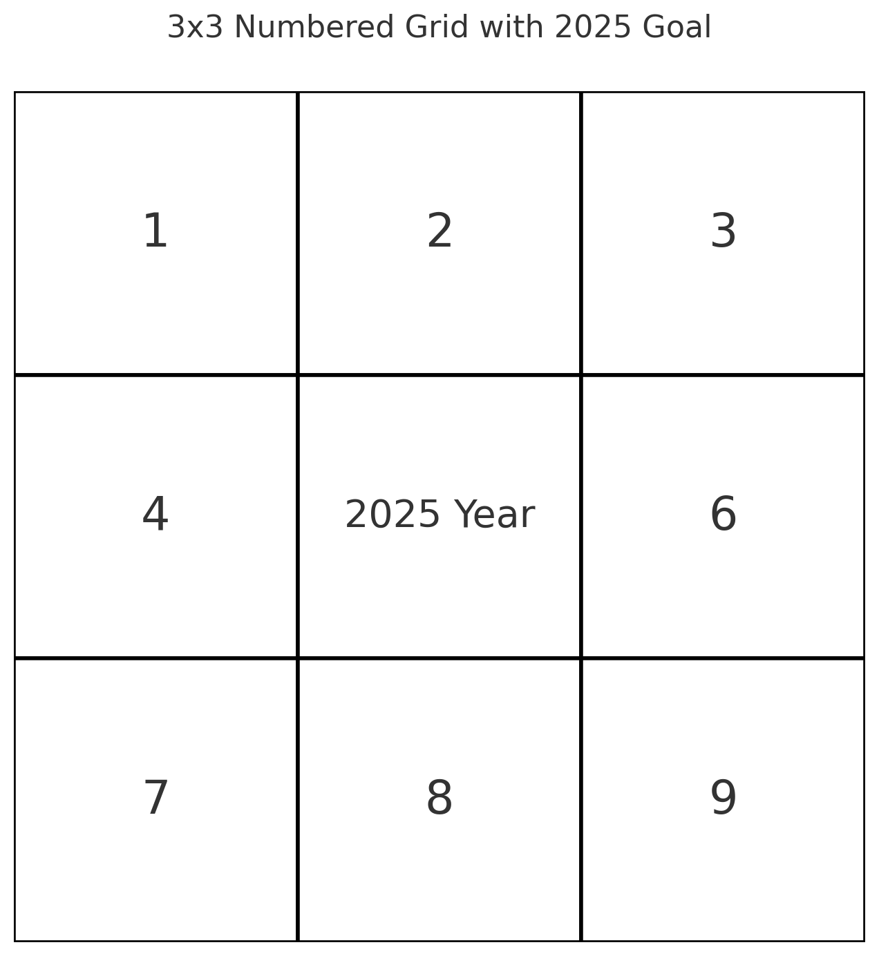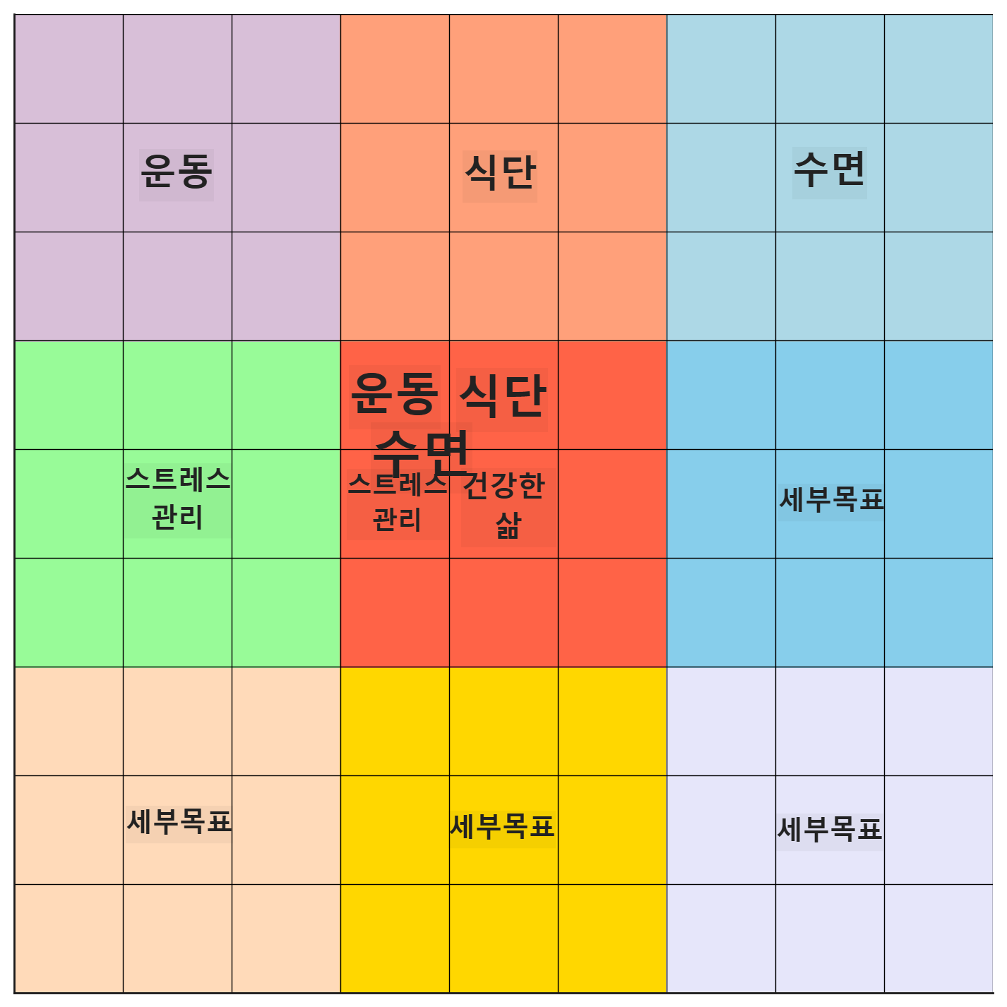 각각의 세부 목표를 새로운 중심으로 삼아 또 다른 3x3 격자를 만들어 세부 전략을 적어 나가세요. 예를 들어 '운동' 칸을 확장하면 '요가', '조깅', '주말 등산'과 같은 실행 가능한 아이디어가 나올 수 있어요.